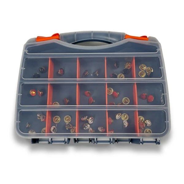 Multi-compartment storage box and Player Pathway Level 1-5 Skills Pins and Master Pins. 15 compartments on each side allow one compartment for each. The transparent covers allow you to see everything at a glance. It has two secure latches to keep everything in place.